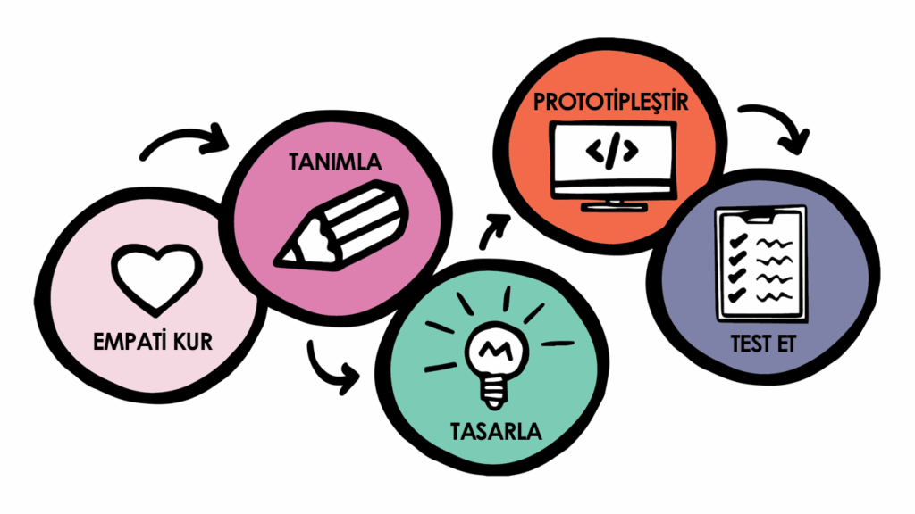 Tasarım odaklı düşünme, yalnızca bir fikir geliştirme yöntemi değil, sistematik bir süreçtir. Genellikle beş aşamada ele